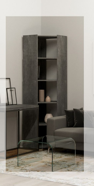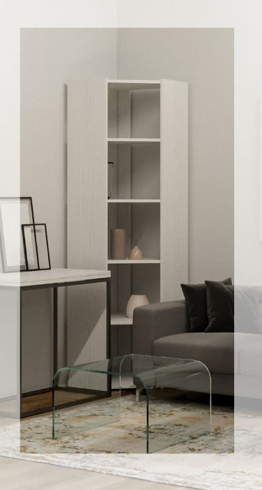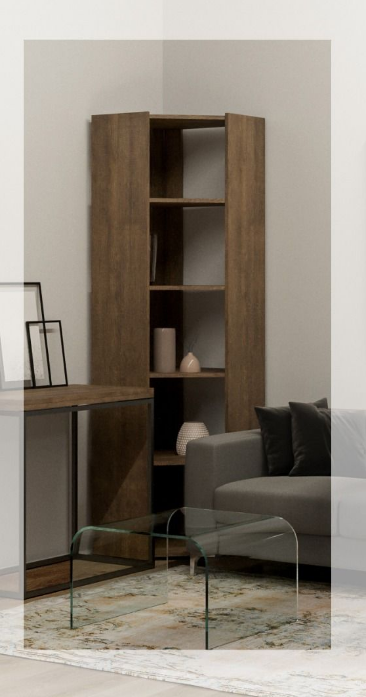 Libreria ad angolo con fianchi laterali pieni. Senza schienale a parete. Abbinabile a tutte le librerie della linea KATO. La libreria è autoportante ma per maggiore sicurezza consigliamo il fissaggio a muro con le staffe in dotazione.