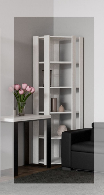 Libreria ad angolo con fianchi laterali a giorno. Senza schienale a parete. Abbinabile a tutte le librerie della linea KATO.