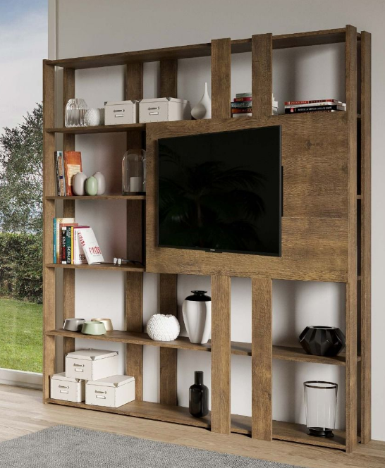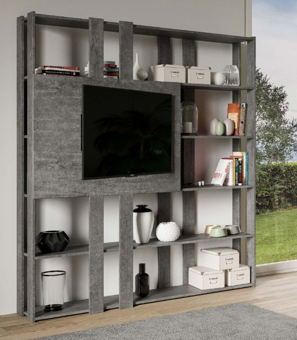 Libreria porta TV Kato N. TV e libreria insieme. I piani orizzontali sono particolarmente resistenti alla flessione essendo 'legati' alle fasce verticali. Durante la fase di montaggio, si può scegliere di avere il pannello TV a destra o a sinistra. I fianchi laterali sono entrambi aperti per una facile esplorazione del vano retrostante. La staffa per agganciare la TV alla libreria è da acquistare a parte. Il pannello porta TV frontale è dotato di foro passacavi. Il peso massimo supportato dal pannello porta TV è di 20 kg.