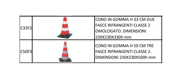 I coni stradali sono dei delimitatori di spazio di forma conica in gomma riciclata. I prodotti sono di colore rosso con strisce bianche rifrangenti, colori che li rendono particolarmente visibili a tutte le ore. Il cono è realizzato in gomma per garantire un’elevata elasticità dell’articolo. La parte conica è verniciata di rosso con vernici antinvecchiamento e, per rendere il cono visibile sia di giorno che di notte, viene applicata una pellicola rifrangente di classe II. La base, di colore nero, è dotata sia nella parte inferiore che superiore di piedini che facilitano l’impilazione dei coni e permettono il deflusso delle acque.